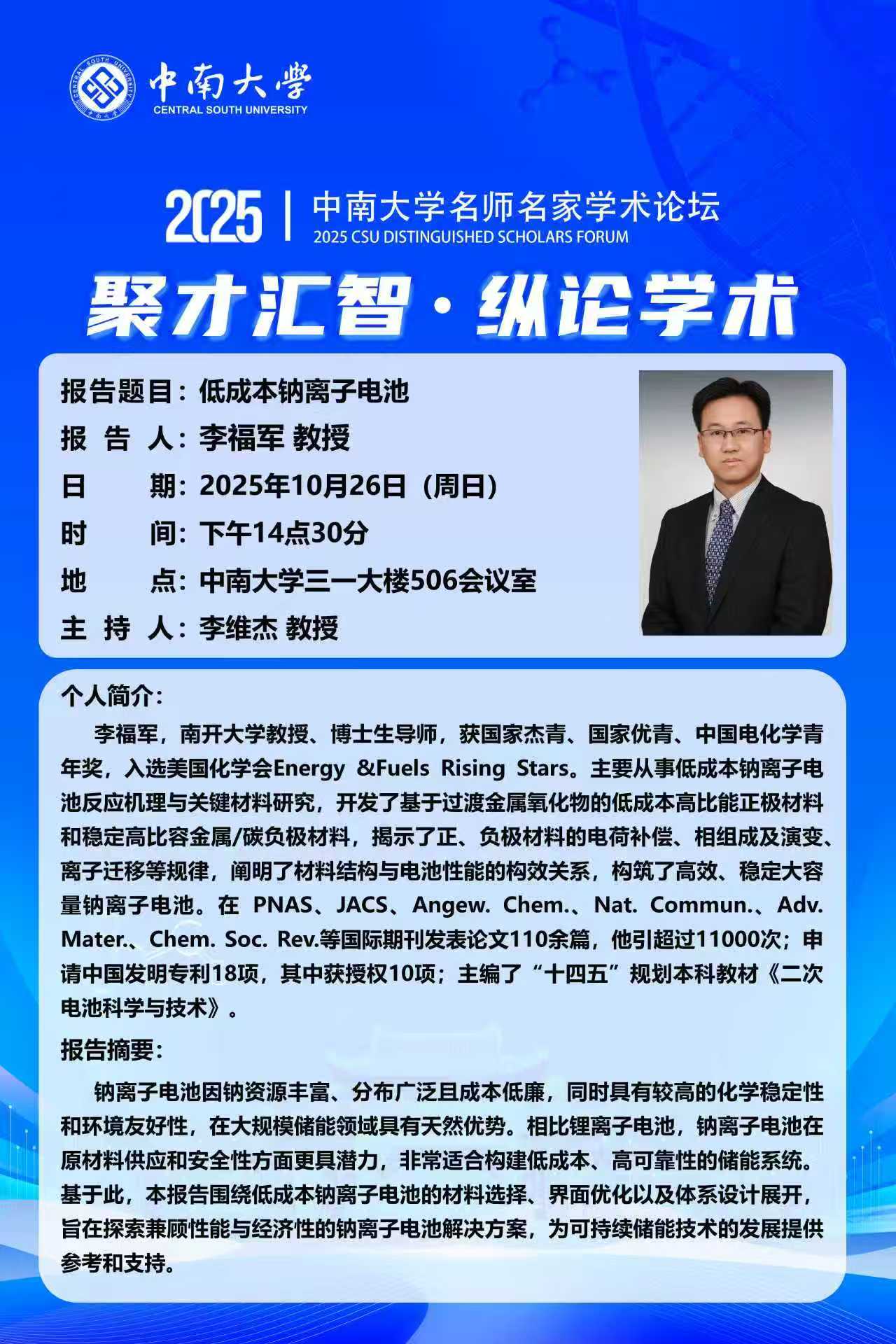李福军,南开大学教授、博士生导师,获国家杰青、国家优青、中国电化学青年奖,入选美国化学会Energy &Fuels Rising Stars。主要从事低成本钠离子电池反应机理与关键材料研究,开发了基于过渡金属氧化物的低成本高比能正极材料和稳定高比容金属/碳负极材料,揭示了正、负极材料的电荷补偿、相组成及演变离子迁移等规律,阐明了材料结构与电池性能的构效关系,构筑了高效、稳定大容量钠离子电池。在 PNAS、JACS、Angew.Chem.、Nat.Commun.、AdvMater.、Chem.Soc.Rev.等国际期刊发表论文110余篇,他引超过11000次;申请中国发明专利18项,其中获授权10项;主编了“十四五”规划本科教材《二次电池科学与技术》。