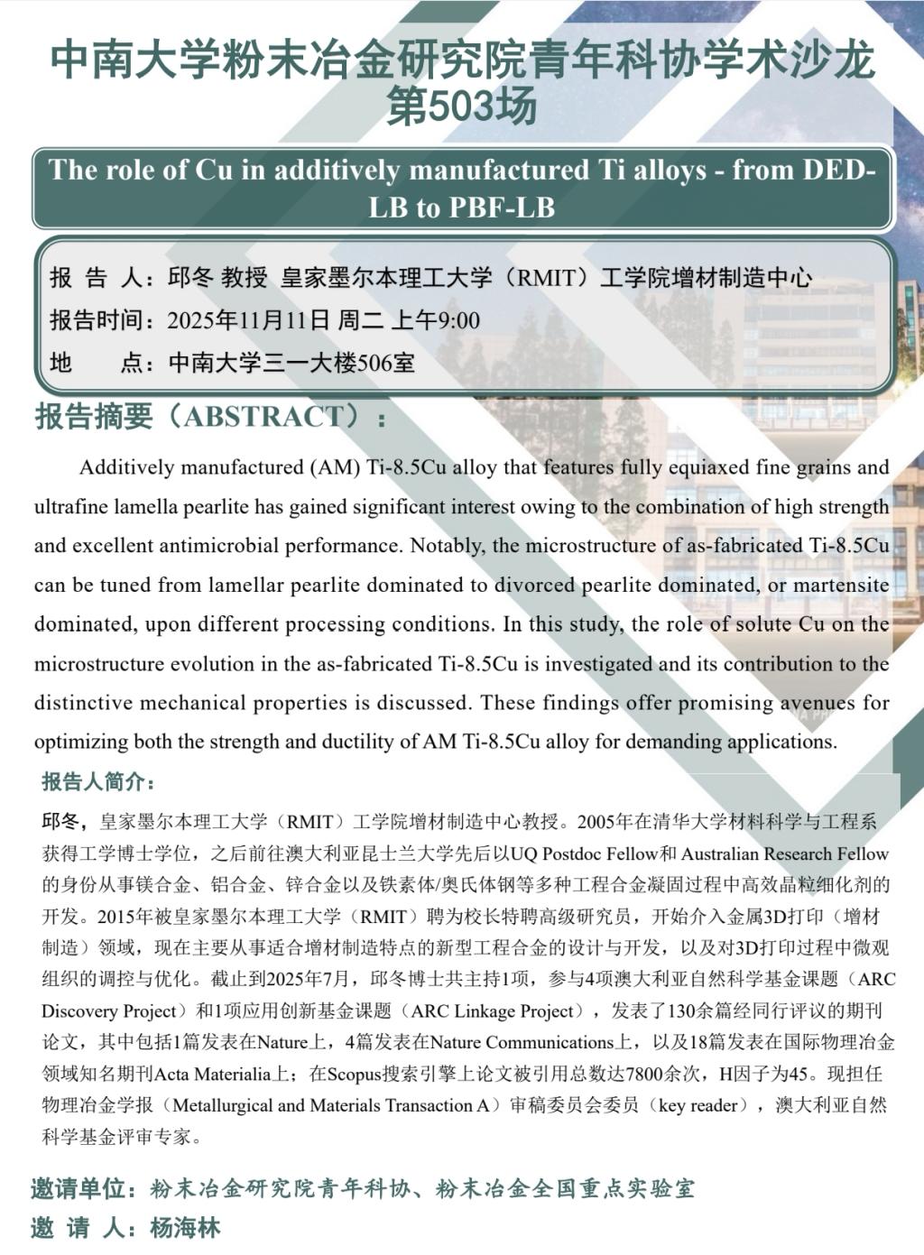 青年科术沙龙(第503场):The role of Cu in additively manufactured Ti alloys-from DED-LB to PBE-LB