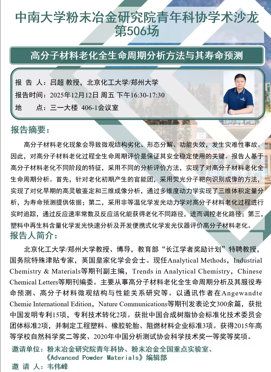青年科协沙龙(第506场):高分子材料老化全生命周期分析方法与其寿命预测