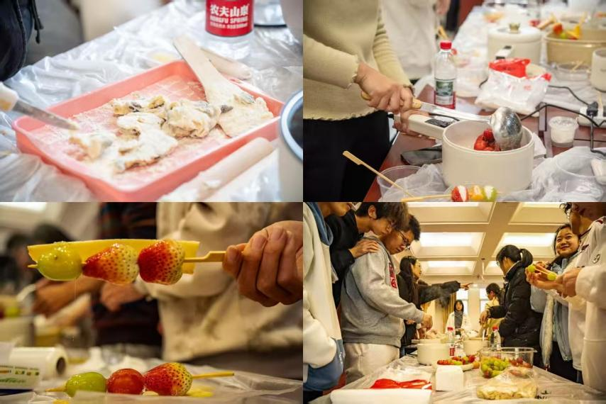 在暖冬美食工坊,同学们亲手制作糖葫芦、雪花酥及糖水,为冬日增添了许多温暖的烟火气。