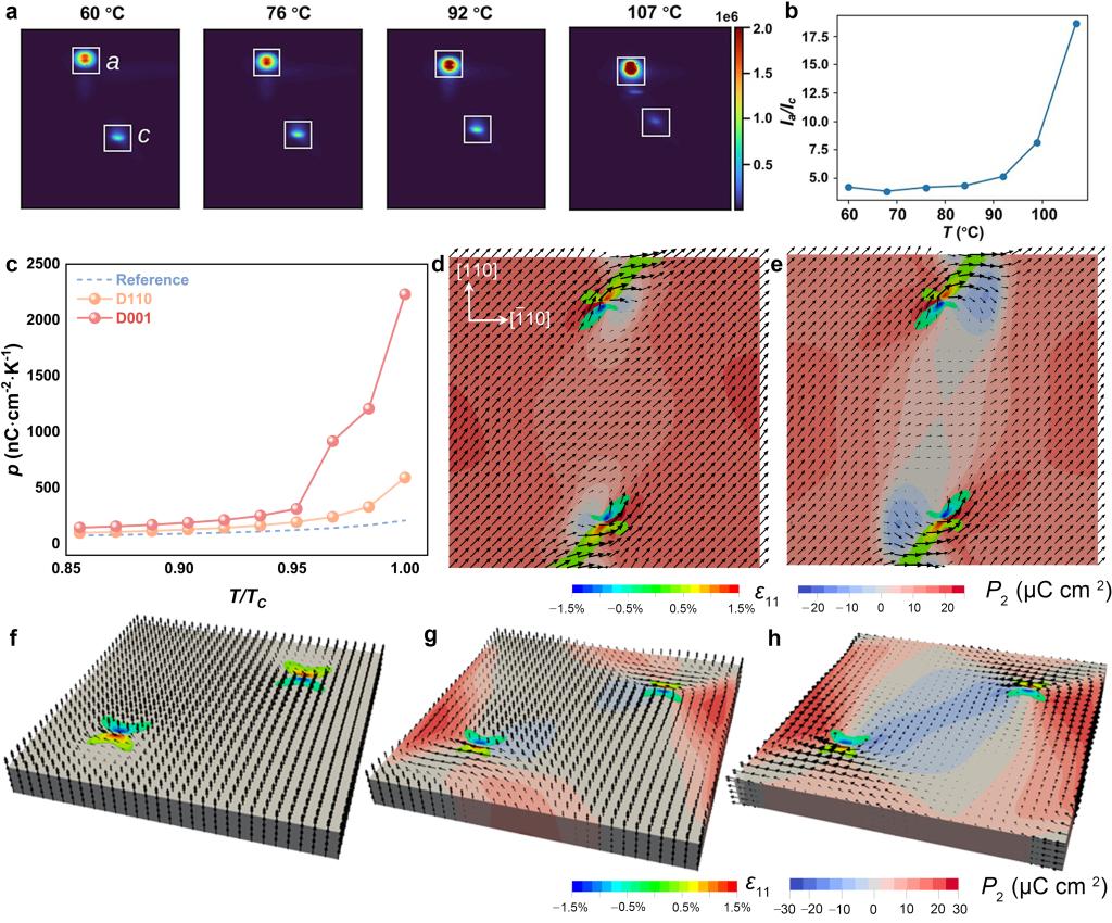 团队通过同步辐射X射线衍射的方法揭示了不同类型铁电畴的温度稳定性,并通过相场模拟的方法获得了不同取向的位错对钛酸钡单晶热释电系数的影响,发现当位错线平行于[001]晶向时,该样品的热释电系数分别是位错线平行于[110]晶向样品和参考样品的4倍和10倍。进一步通过相场模拟揭示了位错-铁电畴的相互作用及热释电性能提升的微观机制,团队发现特定取向的位错不仅能够增加极化对温度的敏感性(内部贡献),还能引起铁电体内部大量的c畴到a畴的切换(外部贡献),这一发现从内部和外部两个方面阐明了位错对热释电性能的影响机制,为未来设计高性能热释电器件提供了新的思路。